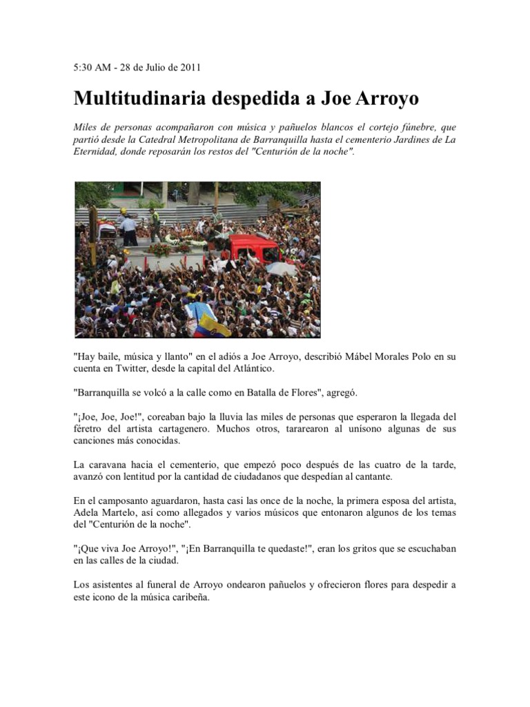 Féretro del cantautor colombiano fue acompañado por miles de personas desde la catedral y hasta el cementerio jardines de la eternidad. Joe arroyo despedido en barranquilla por gran multitud. El parloteo | joe arroyo, 8 años sin el hijo adoptivo de barranquilla. An ambulance transported arroyo's casket during the funeral procession on university ave on saturday. Artista exclusivo del grupo baqombo de barranquilla.